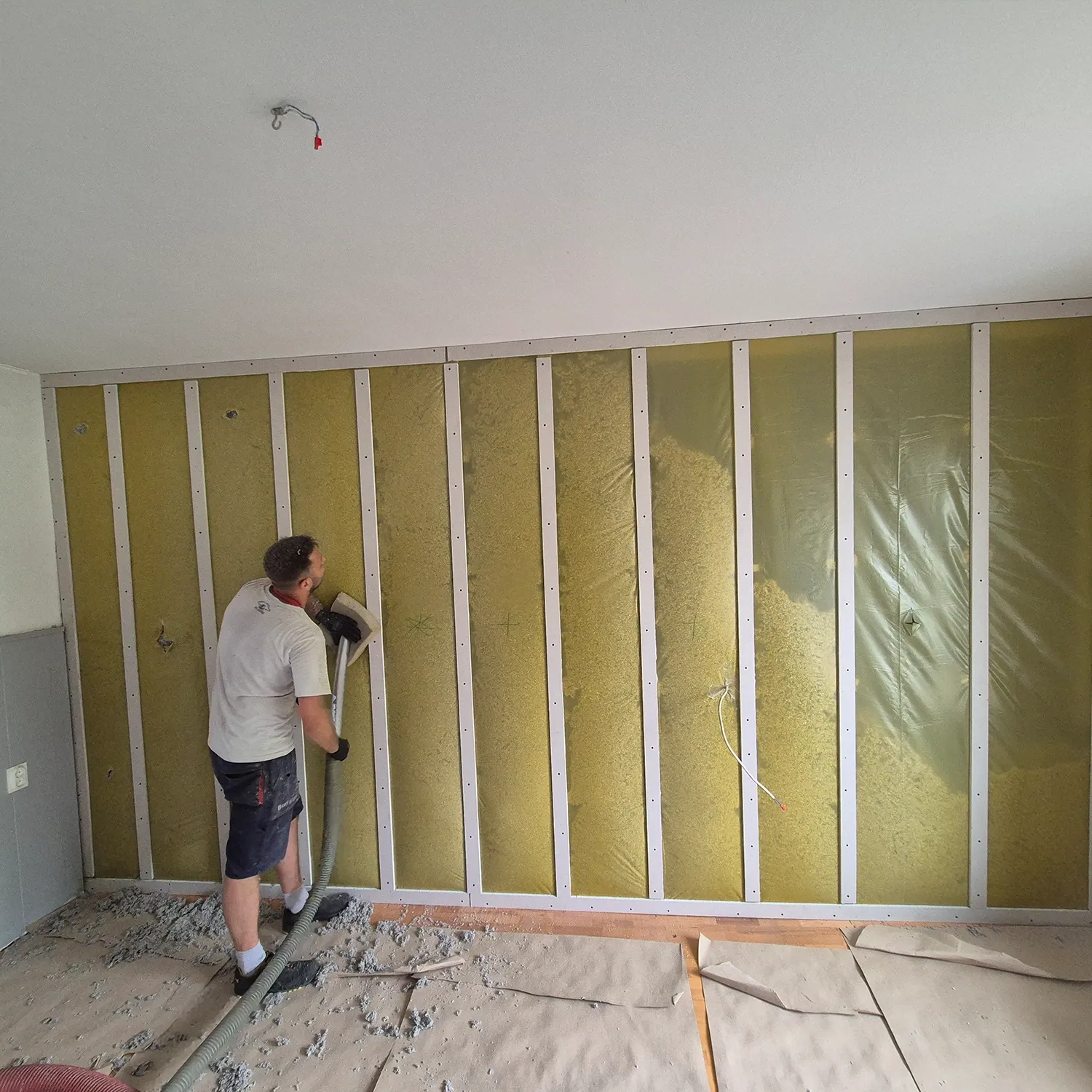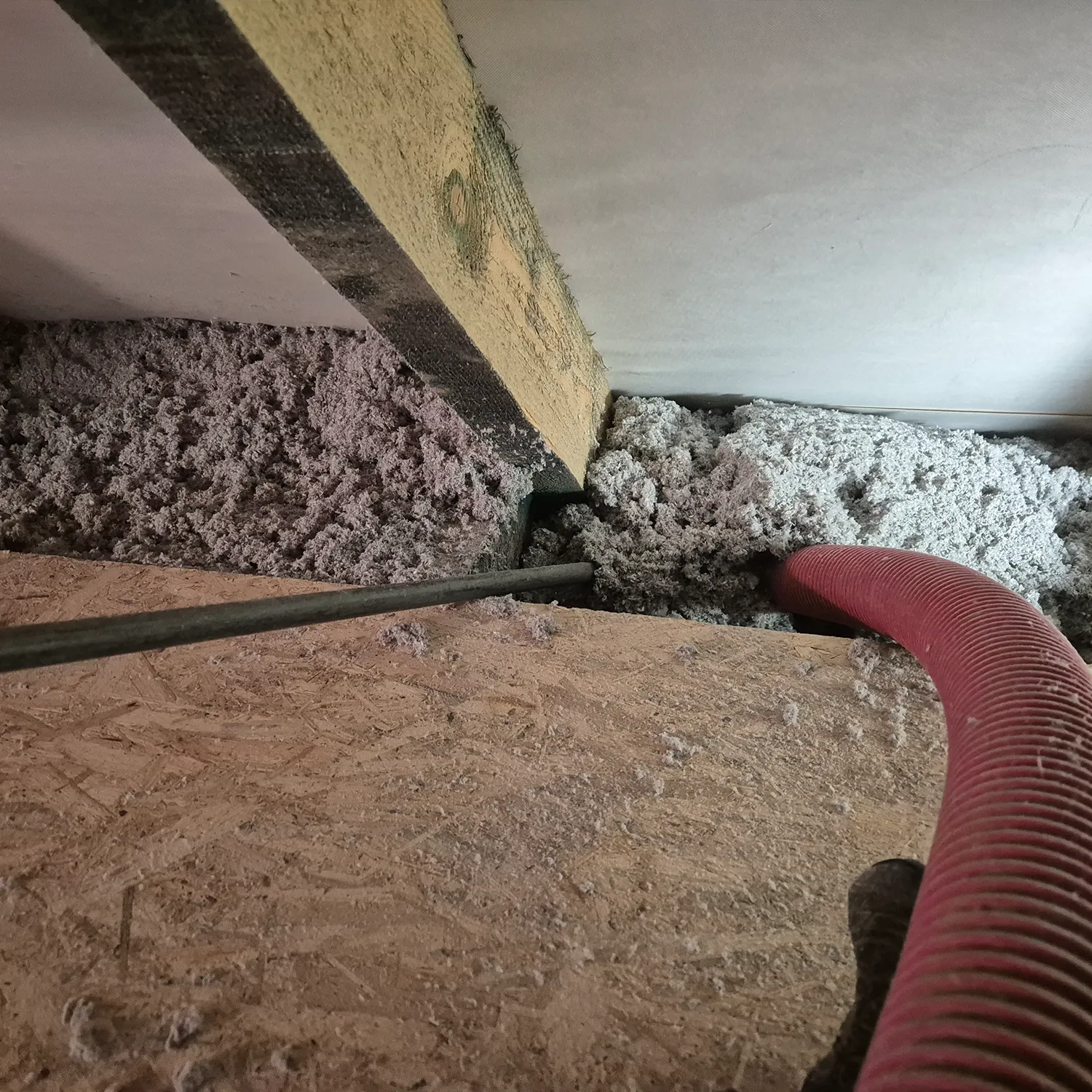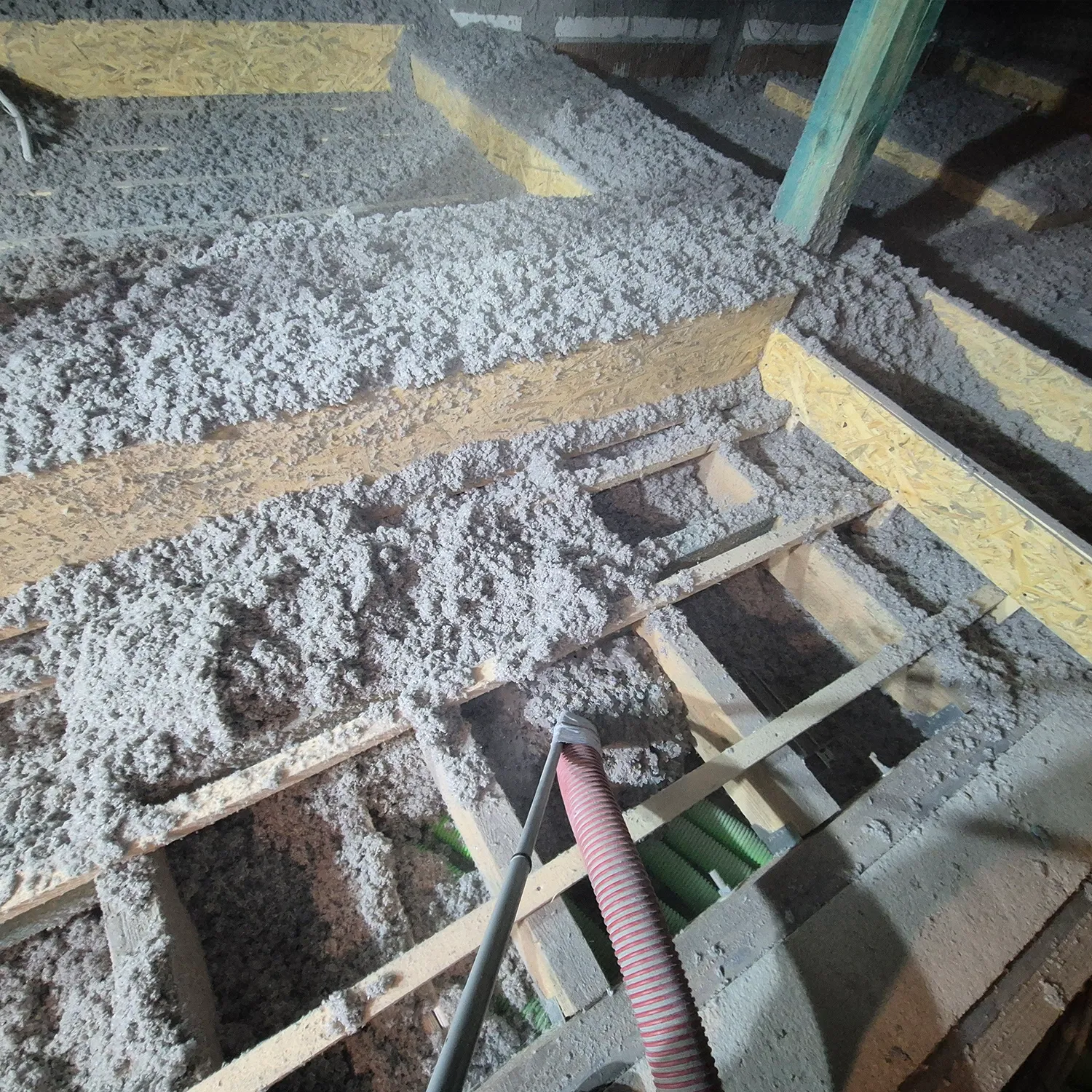 technologia izolacji wdmuchiwanej. Materiał aplikowany pod odpowiednim ciśnieniem dokładnie wypełnia przestrzenie w ścianach, skosach i stropach, tworząc ciągłą barierę izolacyjną bez szczelin i przerw. Efektem jest stabilny mikroklimat i zauważalnie niższe rachunki za ogrzewanie.